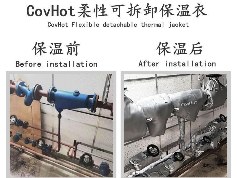 管道閥門保溫選用可拆卸柔性保溫套,保溫效果好,耐高低溫、防水、防油、具有良好的憎水性能,能夠在各種復(fù)雜工況下使用。就傳統(tǒng)鐵皮保溫而言,可拆卸柔性保溫套適用于不同形狀的管道、設(shè)備,特別是對非標(biāo)設(shè)備更有優(yōu)勢,甚至傳統(tǒng)保溫在無法做到的情況,可拆卸柔性保溫套也可以做到。不僅如此,可拆卸柔性保溫套,適合用于有頻繁檢修需求的設(shè)備使用,拆裝便捷,隨檢隨拆,有效提高檢修效率,并且,還能夠多次反復(fù)使用。