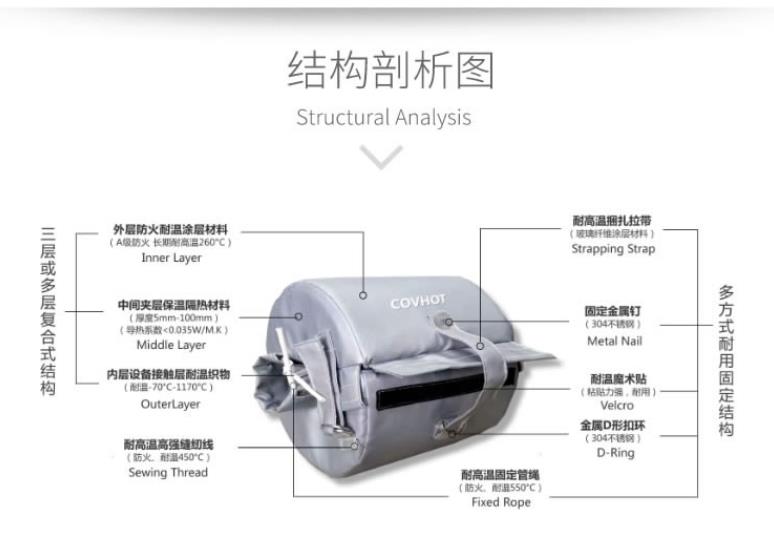 中間層為保溫棉填充層,起保溫隔熱的作用。根據(jù)不同的使用場景,一般選擇導熱系數(shù)低,憎水性好的保溫材料。在特定情況下,我們也會使用多種填充材料相結(jié)合的方案來確保我們的保溫套(衣)符合設(shè)備的需求。