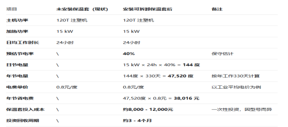 讓我們通過一個簡單的例子來算一筆賬:某 120T 注塑機,加熱功率 15kW,日均工作 24 小時。未安裝保溫套時無節(jié)電效果,安裝可拆卸保溫套后預(yù)估節(jié)電率 40%,日節(jié)電量 144 度,年節(jié)電量 47520 度,年節(jié)省電費 38016 元;保溫套投入成本約 8000-12000 元,投資回收周期約 3-4 個月。