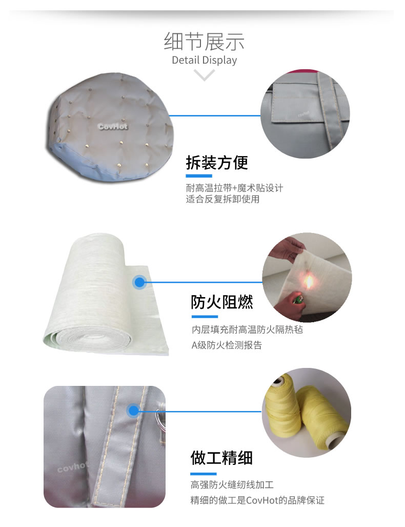 柔性可拆卸人孔保溫套采用柔軟的保溫材料設計,與人孔等設備緊密結合,根據人孔的形狀量身定制,產品外觀整潔,不含石棉及其他有害物質,幫助工廠改善工作熱環境,可以有效防止人員燙傷。