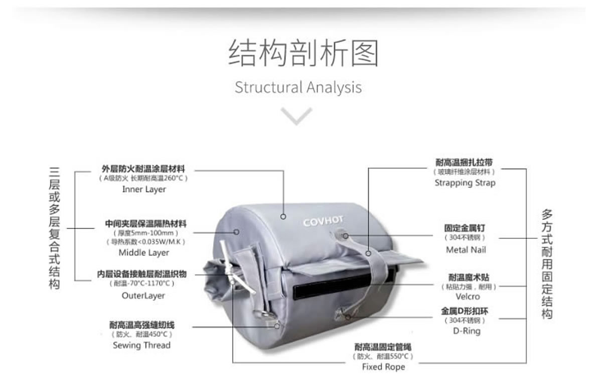 換熱機組保溫隔熱套采用耐高低溫性能優良防火保溫材料;由內層、隔熱層、防護層三層組成,根據設備的具體形狀設計縫制而成的。近些年越來越受到有設備保溫隔熱需求用戶的喜愛。