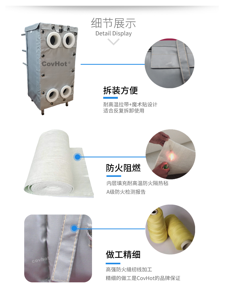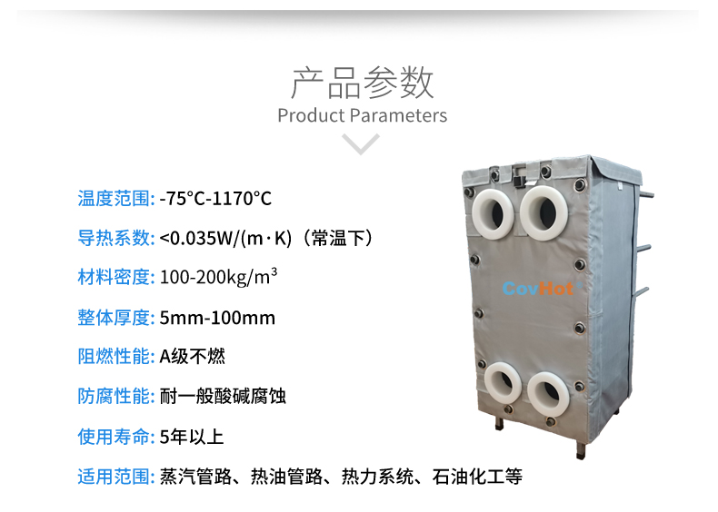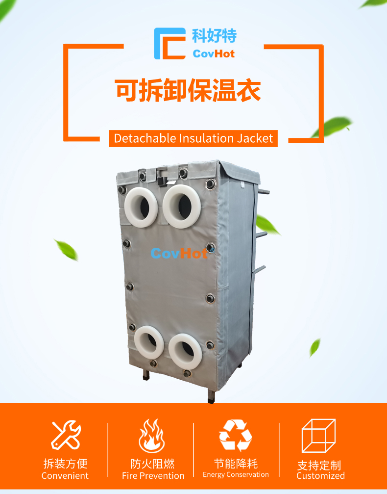 針對以上的問題,河北科好特科技有限責(zé)任公司自主研發(fā)的節(jié)能型板換保溫衣,可以有效減少換熱器的熱量損耗,而且在施工過程中安裝拆卸方便,節(jié)省人工,可拆卸保溫衣還可重復(fù)使用,起到節(jié)能降耗的效果。科好特可拆卸保溫衣根據(jù)設(shè)備不同的尺寸形狀量身定制,可廣泛用于換熱器、閥門、管道及其它需要保溫或防凍的領(lǐng)域。